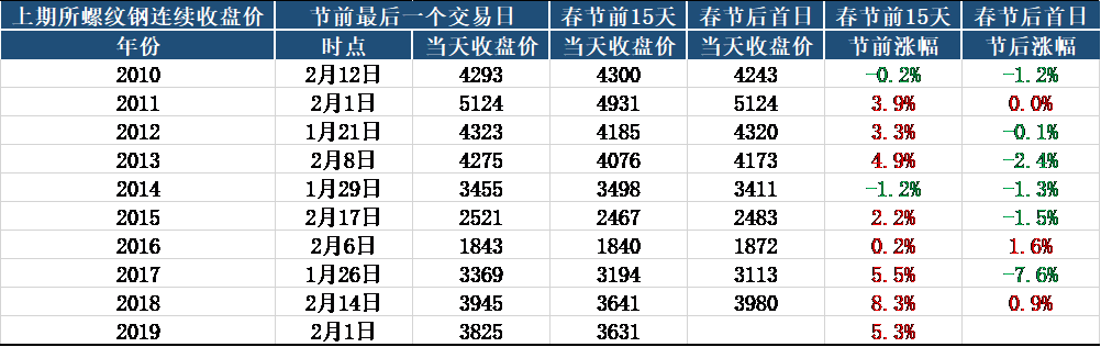 再看期貨,從螺紋鋼上市十年春節(jié)前后價(jià)格對(duì)比來看,節(jié)前15日呈上漲趨勢(shì)的概率較大,但是節(jié)后價(jià)格跌破節(jié)前最后一日收盤價(jià)是大概率事件,今年需警惕類似價(jià)格走勢(shì)的出現(xiàn)。
